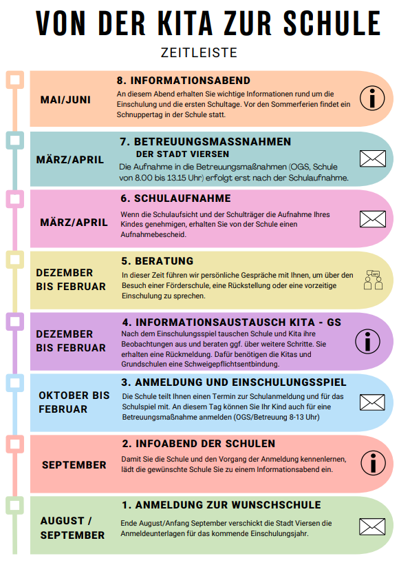 Ein Jahr bevor Ihr Kind schulpflichtig wird, erhalten Sie von der Stadt Viersen einen Brief, der Sie über die Einschulung Ihres Kindes informiert. Nach § 42 Schulgesetz haben Sie das Recht, Ihr Kind an einer Grundschule Ihrer Wahl anzumelden. Sie können zwischen Bekenntnisschulen (katholische Grundschulen), Gemeinschaftsgrund-schulen oder der Primusschule in Viersen wählen. Ihr Kind hat Anspruch darauf, die wohnortnächste Schule zu besuchen, wenn die Aufnahmekapazität der jeweiligen Schule dies zulässt. Die Körnerschule ist vierzügig angelegt und darf jedes Jahr vier 1. Schuljahre bilden, das bedeutet zwischen 83 bis 105 Kinder aufnehmen.